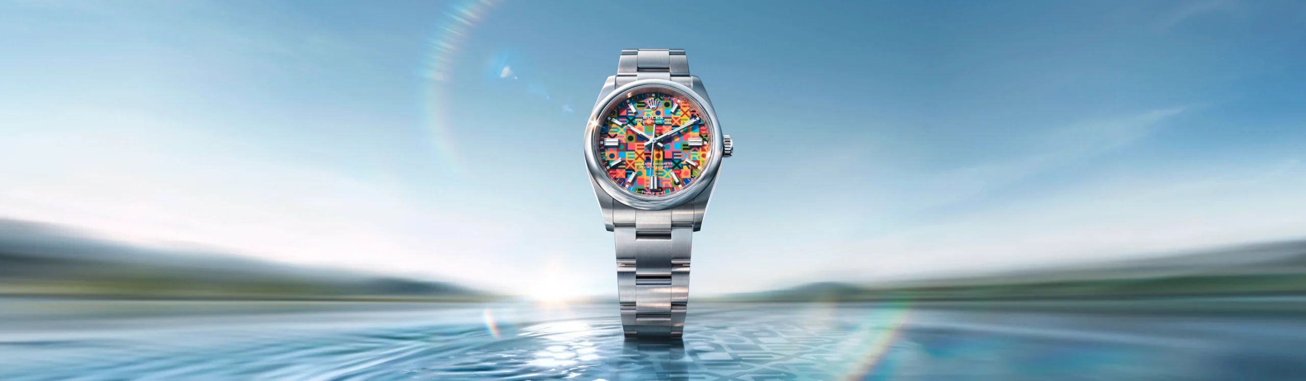 Rolex unveils a new version of the Oyster Perpetual 36 in Oystersteel with a dial decorated with a highly graphic and colourful Jubilee motif, displaying the letters of the Rolex name.